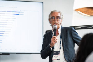De dag begon met een interactieve openingsronde voor een vliegende start. Deelnemers werden door Tom uitgedaagd om te reageren op stellingen door te gaan staan of te blijven zitten. Vragen als “Door de komst van AI heb ik over 5 jaar geen werk meer” of “Ik heb invloed op de toekomst van leren en ontwikkelen” leverden meteen levendige gesprekken op.
